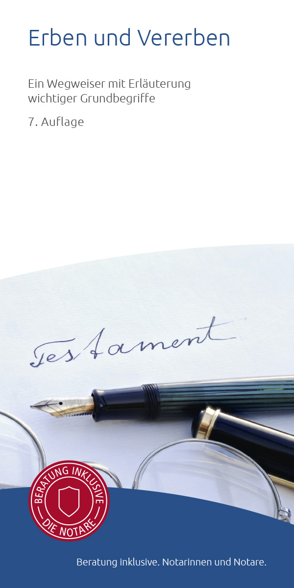 Wer soll mein Erbe sein? Wer bekommt das Haus, das Geld, den Schmuck, kümmert sich um die Grabpflege? Diese Broschüre stellt die gesetzlichen Regeln verständlich dar und zeigt auf, welche Möglichkeiten der eigenen Gestaltung (z.B. mit Testament oder Erbvertrag) Sie mit Unterstützung des Notars haben.